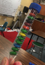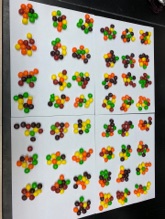 We follow this wet lab activity with a larger visual of the importance of dilutions for counting in microbiology. We put a large bag of candy (M&Ms, Skittles, etc.) into a graduated cylinder or beaker to a round number (1 liter, 700ml, etc) and get student estimates of the total number of candies (write the number down on a post-it, or the worksheet above if this activity immediately follows it). Then we sample 10% of the total volume (100ml or 70ml, following the example volumes above) in another beaker or smaller graduated cylinder, and ask the student groups to count their sample, and extrapolate the total number of candies from the sample. The exact number of candies can be counted if desired, or if 10 samples are given to students in the class the total is the sum of their individual counts. This is analogous to how microbiologists quantify their viruses and microscopic cells through dilution series. We have found some students to be excellent at guessing the correct number of candies before sampling, but that the entire class gets a good estimate of the total after they have counted their sample.
