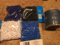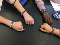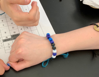 We followed this with a hands-on activity that required the students to use the genetic code in reverse, and determine the mRNA that encodes for a given five letter word. We taught this at Edgar Middle School, so we asked the students to encode EDGAR into mRNA (384 possible combinations of codons, but only two possible combinations of 1st and 2nd codon positions, so it was easy to check student sequences). The students then used four colors of pony beads to represent the a, c, g and u of their mRNA sequence and threaded their sequence onto a twine bracelet, which was knotted shut. Experienced beaders used fancier closures in some classes. The school colors of blue and white worked well.